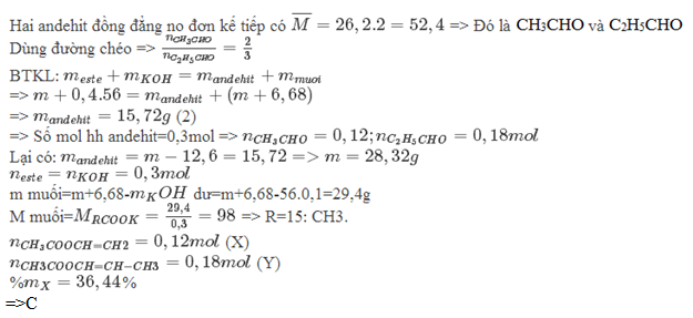 Hỗn hợp A gồm X, Y (MX < MY) là 2 este đơn chức có chung gốc axit. Đun nóng m gam A với 400 ml dung dịch KOH 1M dư thu được dung dịch B và (m – 12,6) gam hỗn hợp hơi gồm 2 anđehit no, đơn chức đồng đẳng kế tiếp có tỉ khối hơi so với H2 là 26,2. Cô cạn dung dịch B thu được (m + 6,68) gam chất rắn khan. % khối lượng của X trong A là: