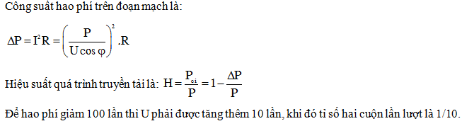 Muốn giảm hao phí trên đường dây tải điện 100 lần thì tỷ số giữa số vòngdây của cuộn