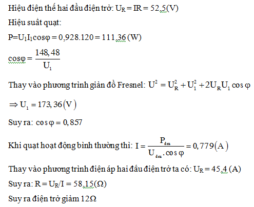 Trong giờ thực hành một học sinh muốn một quạt điện loại 180V - 120W hoạt động bình thường dưới điện áp xoay chiều có giá trị hiệu dụng 220V, nên mắc nối tiếp với quạt một biến trở. Ban đầu học sinh đó để biến trở có giá trị 70Ω thì đo thấy cường độ dòng điện hiệu dụng trong mạch là 0,75A và công suất của quạt điện đạt 92,8%. Muốn quạt hoạt động bình thường thì phải điều chỉnh biến trở