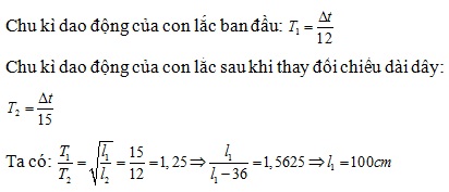 Một con lắc đơn có chiều dài l trong khoảng thời gian ∆t nó thực hiện được 12 dao động. Khi thay đổi độ dài của nó đi 36cm thì trong khoảng thời gian ∆t nói trên nó thực hiện được 15 dao động. Chiều dài ban đầu của con lắc là