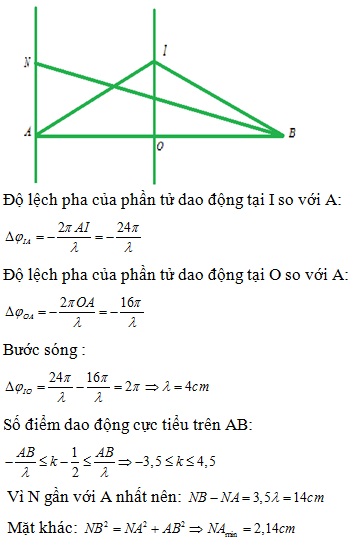 cm luôn dao động cùng pha với I. Điểm N nằm trên mặt nước và nằm trên đường thẳng vuông góc với AB tại A, cách A một khoảng nhỏ nhất bằng bao nhiêu để N dao động với biên độ cực tiểu?