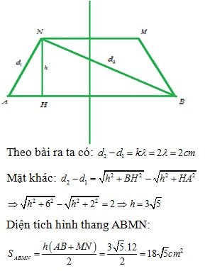 Tại mặt chất lỏng có hai nguồn phát sóng giống nhau A, B cách nhau một đoạn 8cm. Gọi M, N là hai điểm thuộc mặt chất lỏng sao cho MN = 4cm và ABMN là hình thang cân (AB // MN). Bước sóng của sóng trên mặt chất lỏng do các nguồn phát ra là 1cm. Để trong đoạn MN có đúng 5 điểm dao động với biên độ cực đại thì diện tích lớn nhất của hình thang là: