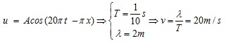 Một sóng cơ truyền dọc theo trục Ox có phương trình u = Acos(20πt – πx) (cm), với t tính băng s.x tính bằng m, tốc độ truyền sóng này bằng: