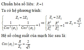 vào hai đầu đoạn mạch R, L, C mắc nối tiếp (cuộn dây thuần cảm). Khi nối tắt tụ C thì điện áp hiệu dụng trên điện trở R tăng 2 lần và dòng điện trong hai trường hợp này vuông pha nhau. Hệ số công suất của đoạn mạch lúc sau bằng