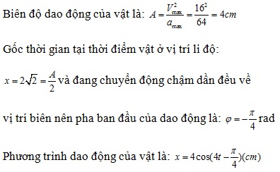 Một vật DĐĐH có tốc độ cực đại 16cm/s và gia tốc cực đại 64cm/s2 . Gốc thời gian lúc vật có li độ