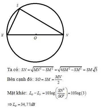 Ba điểm S, M, N nằm trên một đường tròn đường kính MN, biết MN = 2SM. Tại S đặt một nguồn âm đẳng hướng thì mức cường độ âm tại N là 30,00 dB. Mức cường độ âm tại trung điểm MN là