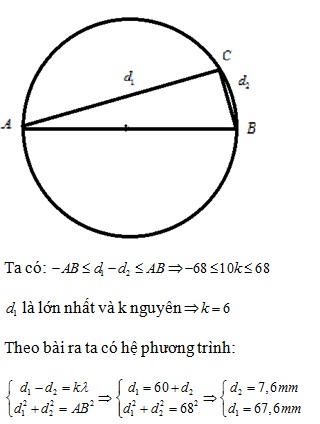 Tại mặt nước, hai nguồn kết hợp được đặt tại hai điểm A và B cách nhau 68mm, dao động điều hòa, cùng cùng tần số, cùng pha theo phương vuông góc với mặt nước. Trên AB, hai phần tử nước dao động với biên độ cực đại có vị trí cân bằng cách nhau một đoạn ngắn nhất là 10mm. Điểm C là vị trí cân bằng của phần tử ở mặt nước nằm trên đường tròn đường kính AB. Phần tử nước ở C dao động với biên độ cực đại. Khoảng cách AC lớn nhất bằng: