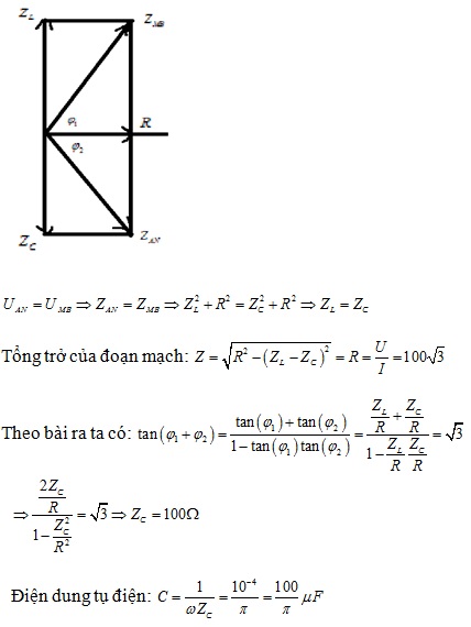 V tần số f = 50 Hz, và cường độ hiệu dụng chạy qua mạch là 1A. Điện áp tức thời trên đoạn AN và trên đoạn MB lệch pha nhau