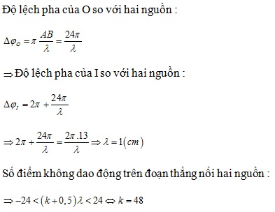 Trên mặt một chất lỏng có hai nguồn sóng kết hợp, cùng pha S1, S2 cách nhau 24 cm, dao động theo cùng phương thẳng đứng. Khoảng cách ngắn nhất từ trung điểm I của S1S2 đến điểm nằm trên đường trung trực của S1S2 dao động cùng pha với I bằng 5 cm. Số điểm không dao động trên đoạn S1S2 là