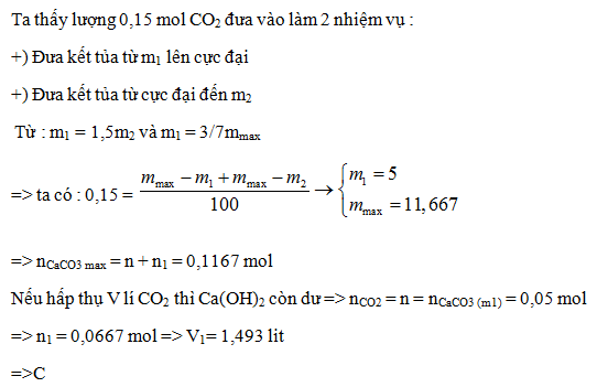 Hấp thụ hoàn toàn V lít CO2 vào dung dịch Ca(OH)2 a M thì thu được m1 gam kết tủa. Nếu hấp thụ (V + 3,36) lít CO2 vào dung dịch Ca(OH)2 trên thì thu được m2 gam kết tủa. Nếu thêm (V+V1) lít CO2 vào dung dịch Ca(OH)2 đã cho thì thu được lượng kết tủa cực đại. Biết m1 : m2 = 3 : 2 ; m1 bằng 3/7 khối lượng kết tủa cực đại ; các khí đều ở đktc). Giá trị của V1 là