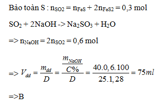 Đốt nóng 8,8 g FeS và 12 g FeS2, khí thu được cho vào V ml dung dịch NaOH 25% (d = 1,28g/ml) vừa đủ được muối trung hòa. Giá trị của V là: