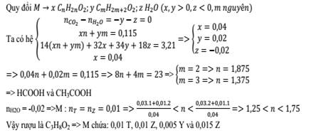 X, Y là hai axit cacboxylic no, đơn chức, mạch hở, đồng đẳng kế tiếp (MX < MY) T là este tạo bởi X, Y với một ancol hai chức Z . Đốt cháy hoàn toàn 3,21g hỗn hợp M gồm X, Y ,Z ,T bằng lượng vừa đủ khí O2, thu được 2,576 lít CO2 (đktc) và 2,07g H2O. Mặt khác 3,21g M phản ứng vừa đủ với 200ml dung dịch KOH 0,2M, đun nóng. Phát biểu nào sau đây là sai?
