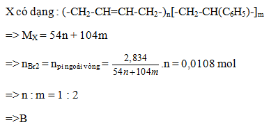 Tiến hành phản ứng đồng trùng hợp giữa stiren và buta-1,3-đien, thu được polime X. Cứ 2,834g X phản ứng vừa hết với 1,731g Br2. Tỉ lệ số mắt xích butađien : stiren trong loại polime trên là :
