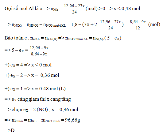 Cho 12,96 gam hỗn hợp Al và Mg tác dụng vừa đủ với dung dịch chứa 1,8 mol HNO3 tạo ra sản phẩm khử X duy nhất. Làm bay hơi dung dịch sau phản ứng thu được m gam muối khan, m là?