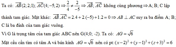 Trong không gian với hệ tọa độ Oxyz, cho ba điểm A(2;1;-3), B(4;3;-2), C(6;-4;-1). Chứng minh rằng A, B,C là ba đỉnh của một tam giác vuông và viết phương trình mặt cầu tâm A đi qua trọng tâm G của tam giác ABC.