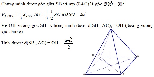 , BD = 2a; hai mặt phẳng (SAC) và (SBD) cùng vuông góc với mặt phẳng (ABCD). Biết góc giữa đường thẳng SB và mặt phẳng (SAC) bằng 300. Tính thể tích khối chóp S.ABCD và khoảng cách giữa 2 đường thẳng SB và AC.