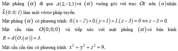 (1,0 điểm).Trong không gian với hệ tọa độ Oxyz, cho điểm A(2; -1; 3). Viết phương trình mặt phẳng (α) đi qua A và vuông góc với trục Oz. Viết phương trình mặt cầu tâm O tiếp xúc với mặt phẳng (α).