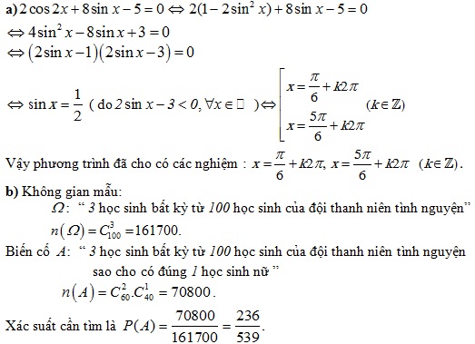 (1,0 điểm). a) Giải phương trình 2cos 2x + 8sin x – 5 = 0 (x ∈ R) b) Đội thanh niên tình nguyện