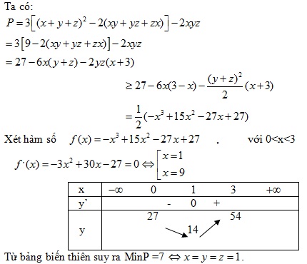 (1,0 điểm) Cho x, y, z là ba số thực dương có tổng bằng 3. Tìm giá trị nhỏ nhất
