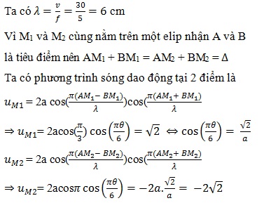 Ở mặt thoáng chất lỏng có hai nguồn sóng kết hợp dao động với phương trình uA = uB = a cos 10πt (với u tính bằng mm, t tính bằng s). Coi biên độ sóng không đổi, tốc độ truyền sóng v = 30cm/s. Hai điểm M1; M2 cùng nằm trên một elip nhận A, B là tiêu điểm có M1 A – M1B = - 2 cm và M2A – M2B = 6 cm. Tại thời điểm li độ của phần tử chất lỏng tại M1 là