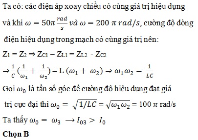 Đặt vào hai đầu một đoạn mạch RLC nối tiếp các điện áp xoay chiều u1, u2, u3 có cùng giá trị hiệu dụng nhưng có tần số khác nhau thì thu được các cường độ dòng điện tương ứng là i1 = I0cos50πt(A); i2 = I0 cos(200πt+2π/3) (A); i3 = I03 cos (100πt-2π/3 (A). Ta có hệ thức: