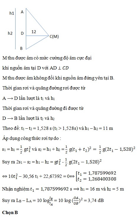 Từ điểm A bắt đầu thả rơi tự do một nguồn phát âm có công suất không đổi, khi chạm đất tại B nguồn âm đứng yên luôn. Tại C ở khoảng giữa A và B (nhưng không thuộc AB), có một máy M đo mức cường độ âm, C cách AB 12 m. Biết khoảng thời gian từ khi thả nguồn đến khi máy M thu được âm có mức cường độ âm cực đại, lớn hơn 1,528s so với khoảng thời gian từ đó đến khi máy M thu được âm có mức cường độ âm không đổi; đồng thời hiệu hai khoảng cách tương ứng này là 11 m. Bỏ qua sức không khí, lấy g = 10 m/s2 . Hiệu giữa mức cường độ âm cuối cùng và đầu tiên xấp xỉ
