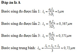 Trong đó a là khoảng cách giữa hai khe hẹp, D là khoảng cách từ mặt phẳng chứa hai khe hẹp đến màn ảnh và L là khoảng cách giữa 5 vân sáng liên tiếp. Giá trị trung bình của bước sóng ánh sáng mà nhóm học sinh này tính được xấp xỉ bằng