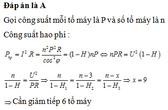 Một nhà máy phát điện gồm nhiều tổ máy có cùng công suất có thể hoạt động đồng thời, điện sản xuất ra được đưa lên đường dây rồi truyền đến nơi tiêu thụ. Coi điện áp nơi truyền đi là không đổi. Khi cho tất cả các tổ máy hoạt động đồng thời thì hiệu suất truyền tải là 80%; còn khi giảm bớt 3 tổ máy hoạt động thì hiệu suất truyền tải là 85%. Để hiệu suất truyền tải đạt 95% thì số tổ máy phải giảm bớt tiếp là