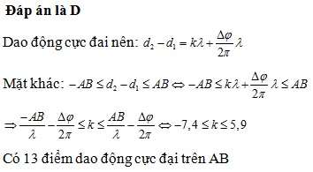 )(cm). Biết A, B cách nhau 20(cm), bước sóng là 3(cm). Số đường cực đại giao thoa quan sát được trên mặt nước là