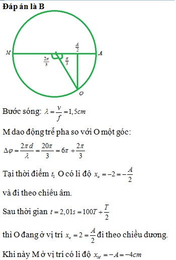Một nguồn O dao động với tần số 50(Hz), tạo sóng trên mặt nước với biên độ 4(cm). Vận tốc truyền sóng là 75(cm/s). M là điểm trên mặt nước cách O một đoạn 5(cm). Tại thời điểm t1 li độ của điểm O là -2(cm) đang đi theo chiều âm. Li độ của M tại thời điểm t2= t1+2,01 (s) là