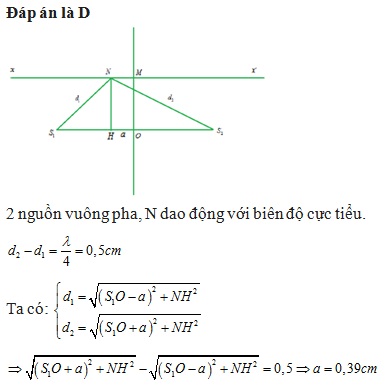 Trên mặt nước có hai nguồn S1 và S2 cách nhau 5(cm) có phương trình lần lượt là: u1 = acos(ωt- π/4) và u2= acos(ωt+π/4). Bước sóng lan truyền là 2(cm). Đường thẳng xx’ song song với S1S2, cách S1S2 một khoảng 3(cm). Gọi M là giao điểm của xx’ với đường trung trực của S1S2. Khoảng cách gần nhất từ M đến điểm dao độngvới biên độ cực tiểu nằm trên xx’ là
