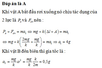. Tại thời điểm vật B tới vị trí thấp nhất thì dây treo vật A bị tuột ra. Gia tốc rơi tự do là g. Gia tốc