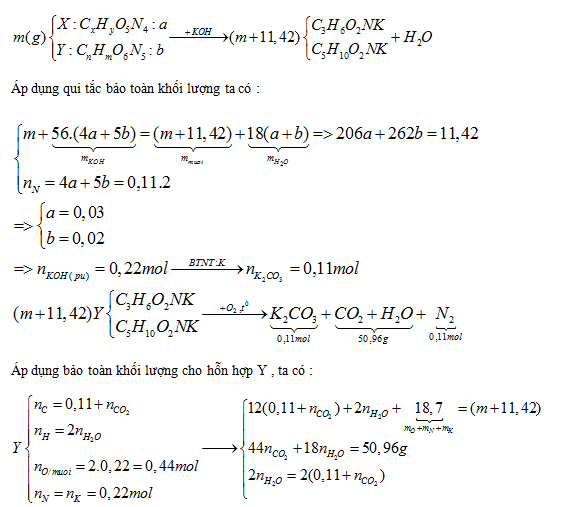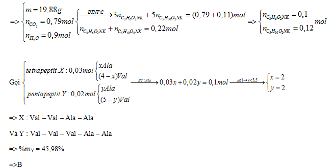 Thủy phân hoàn toàn m gam hỗn hợp M gồm tetrapeptit X và pentapeptit Y (đều mạch hở) bằng dung dịch KOH vừa đủ, rồi cô cạn cẩn thận thì thu được (m + 11,42) gam hỗn hợp muối khan của Val và Ala. Đốt cháy hoàn toàn muối sinh ra bằng một lượng oxi vừa đủ thu được K2CO3; 2,464 lít N2 (đktc) và 50,96 gam hỗn hợp gồm CO2 và H2O. Phần trăm khối lượng của Y trong hỗn hợp M có thể là