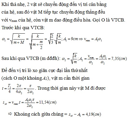 Một con lắc lò xo đặt trên mặt phẳng ngang gồm lò xo nhẹ có một đầu cố định, đầu kia gắn vật nhỏ m. Ban đầu vật m được giữ ở vị trí lò xo bị nén 9cm. Vật M có khối lượng bằng một nửa vật m và nằm sát m. Thả nhẹ để hai vật chuyển động dọc theo trục lò xo. Bỏ qua mọi ma sát. Ở thời điểm lò xo có chiều dài cực đại lần đầu tiên thì khoảng cách giữa hai vật m và M là