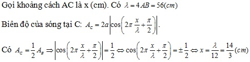 Một sợi dây đàn hồi căng ngang đang có sóng dừng ổn định. Trên dây A là một điểm nút, B là điểm bụng gần A nhất, AB = 14cm. Gọi C là một điểm trong khoảng AB có biên độ bằng một nửa biên độ của B. Khoảng cách AC là