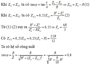 so với điện áp hai đầu đoạn mạch. Khi ZC = ZC2 =6,25ZC1 thì điện áp hiệu dụng giữa hai bản tụ đạt giá trị cực đại. Hệ số công suất của mạch là
