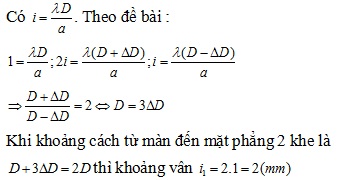 Trong thí nghiệm giao thoa I-âng, nguồn S phát ra ánh sáng đơn sắc có bước sóng λ. Đặt một màn quan sát cách mặt phẳng hai khe một khoảng D thì khoảng vân là 1mm. Khi khoảng cách từ màn quan sát đến mặt phẳng hai khe lần lượt là D + ∆D hoặc D - ∆D thì thu được khoảng vân trên màn tương ứng là 2i và i. Nếu khoảng cách từ màn quan sát đến mặt phẳng hai khe là thì khoảng vân trên màn là