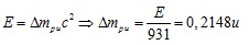 Cho phản ứng phân hạch Uran 238: . Biết 1u = 931Mev /c2 Độ hụt khối của phản ứng