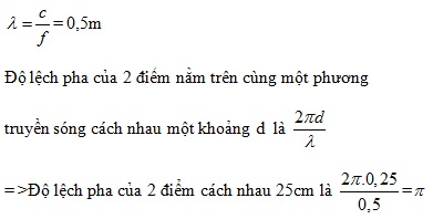 Hai điểm cùng nằm trên một phương truyền sóng , cách nhau 25cm . Tần số sóng là 20Hz, tốc độ truyền sóng là 10 m/s. Độ lệch pha của dao dộng tại hai điểm trên là
