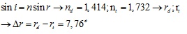 Một tia sáng Mặt Trời từ không khí đến mặt thủy tinh với góc tới i = 600 . Biết chiết suất của thủy tinh đối với ánh sáng Mặt Trời nằm trong khoảng từ 1,414 đến 1,732. Góc lớn nhất hợp bởi tia khúc xạ đỏ và tia khúc xạ tím là