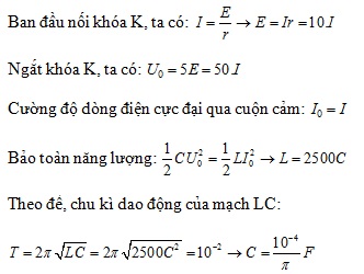 Một mạch dao động điện từ lý tưởng gồm cuộn cảm thuần có độ tự cảm L và tụ điện có điện dung C. Ban đầu nối mạch với nguồn điện một chiều có suất điện động E và điện trở trong 10Ω bằng khóa K . Khi dòng điện trong mạch đã ổn định , ngắt khóa K , trong khung có dao động điện từ tự do với chu kì 10-2 s. Biết hiệu điện thế cực đại ở hai đầu tụ điện lớn gấp 5 lần suất điện động E. Giá trị của điện dung C bằng