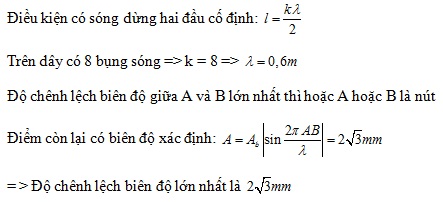 Một sợi dây đàn hồi dài 2,4 m, căng ngang , hai đầu cố định . Trên dây đang có sóng dừng với 8 bụng sóng . Biên độ bụng sóng là 4mm. Gọi A và B là hai điểm nằm trên dây cách nhau 20 cm. Biên độ của hai điểm A và B hơn kém nhau một lượng lớn nhất bằng