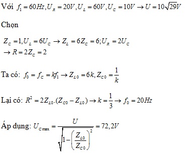 Đặt điện áp xoay chiều có giá trị hiệu dụng U không đổi, tần số f thay đổi được vào hai đầu đoạn mạch gồm điện trở thuần R, cuộn cảm thuần L và tụ điện C mắc nối tiếp. Điều chỉnh f = 60 Hz thì thấy điện áp hiệu dụng giữa hai đầu của các phần tử R, L, C tương ứng là 20 V, 60 V, 10 V. Điều chỉnh f = f0 thì điện áp hiệu dụng giữa hai đầu tụ điện đạt cực đại UCmax. Giá trị của f0 và UCmax lần lượt là