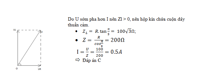 Hộp kín chứa một tụ điện hoặc một cuộn dây thuần cảm. Người ta mắc nối tiếp hộp kín với điện trở thuần R = 100Ω. Khi đặt vào đoạn mạch điện áp u =100