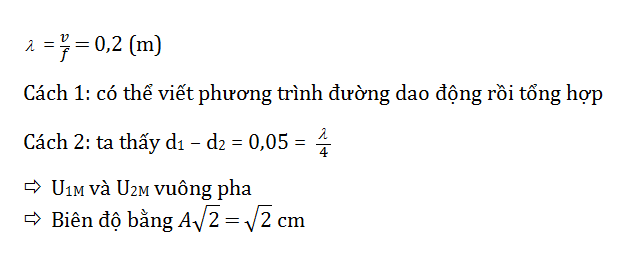 Trên mặt nước có 2 nguồn dao động kết hợp S1 và S2 dao động với phương trình u = cos(50πt) cm. Tốc độ truyền sóng trên mặt nước là 5m/s. Xem biên độ sóng không thay đổi trong quá trình truyền đi. Biên độ dao động tại điểm M trên mặt nước cách S1 và S2 lần lượt là d1 = 15cm và d2 = 10cm là