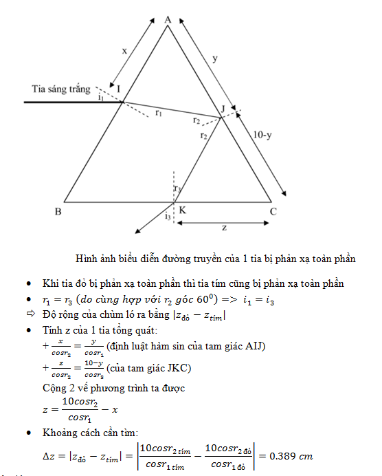 Lăng kính có tiết diện là tam giác đều ABC, góc chiết quang A, mặt bên có độ rộng a = 10cm. Chiếu tia sáng trắng tới mặt bên AB của lăng kính theo phương song song với BC sao cho toàn bộ chùm khúc xạ ở mặt AB truyền đến AC. Biết rằng chiết suất của lăng kính đối với ánh sáng đỏ vừa vặn thỏa mãn điều kiện phản xạ toàn phần tại AC và chiết suất đối với ánh sáng tím là