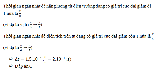 Trong mạch dao động có dao động điện từ tự do. Thời gian ngắn nhất để năng lượng điện trường đang có giá trị cực đại giảm đi một nửa là 1,5.10-4 s. Thời gian ngắn nhất để điện tích trên tụ đang có giá trị cực đại giảm còn một nửa là