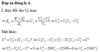cos100πt(V) vào hai đầu đoạn mạch RLC nối tiếp. Biết cuộn dây thuần cảm có độ tự cảm thay đổi được. Điều chỉnh L để điện áp hiệu dụng hai đầu L cực đại, khi đó điện áp hiệu dụng hai đầu tụ là 200V. Giá trị cực đại của điện áp hai đầu cuộn cảm là