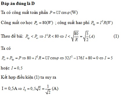 Một động cơ điện xoay chiều khi hoạt động bình thường với điện áp hiệu dụng 220 V thì sinh ra công suất cơ học là 80 W. Biết động cơ có hệ số công suất 0,8, điện trở thuần của dây cuốn là 32 Ω, công suất toả nhiệt nhỏ hơn công suất cơ học. Bỏ qua các hao phí khác, cường độ dòng điện cực đại qua động cơ là: