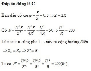 Cho đoạn mạch xoay chiều gồm một điện trở R, một tụ điện có điện dung C biến đổi được và một cuộn dây chỉ có hệ số tự cảm L mắc nối tiếp với nhau. Điện áp tức thời giữa hai đầu đoạn mạch là u =U0cos100πt(V) . Ban đầu độ lệch pha giữa u và i là 60° thì công suất tiêu thụ trong mạch P = 50W. Thay đổi tụ C để u cùng pha i thì mạch tiêu thụ công suất